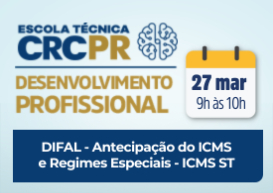 A próxima Escola Técnica CRCPR acontecerá no dia 27 de março, das 9h às 10h, na TV CRCPR. O palestrante convidado será Níkolas Duarte (currículo), que apresentará o tema "ICMS ST- DIFAL - Antecipação do ICMS e Regimes Especiais". A mediação estará a cargo do conselheiro Rodinei Bonfadini. Durante o evento, serão abordados os fundamentos gerais do ICMS ST e as diferenças entre o diferencial de alíquotas do ICMS e as antecipações exigidas pela legislação paranaense. Além disso, serão discutidos regimes especiais para o recebimento de mercadorias sem a cobrança do ICMS ST.
